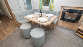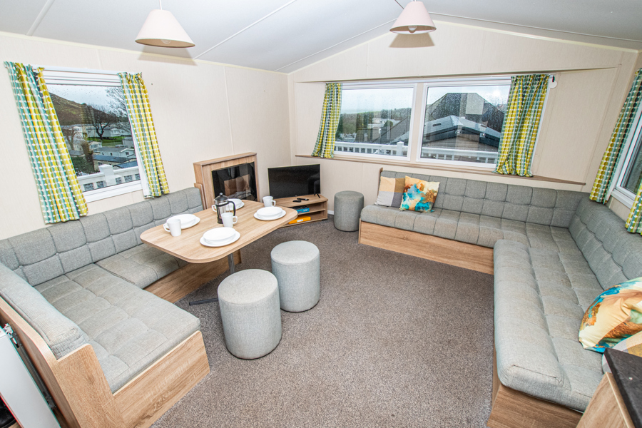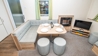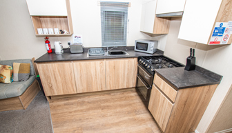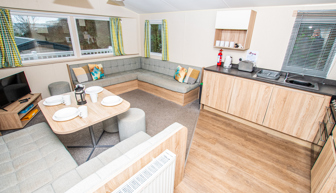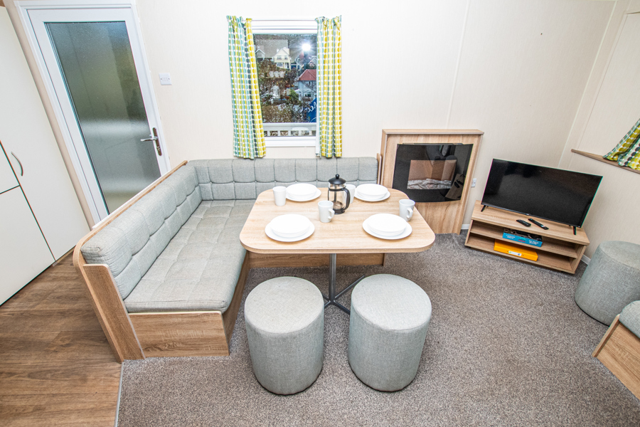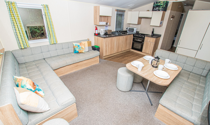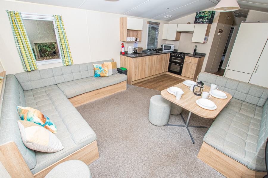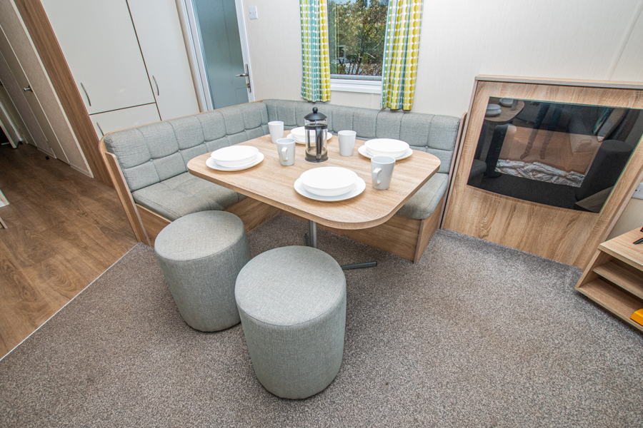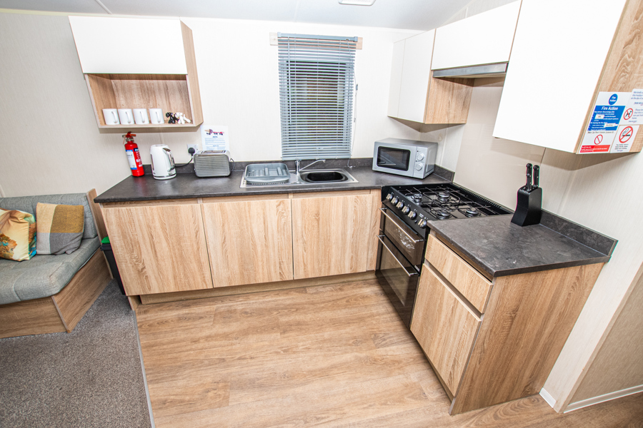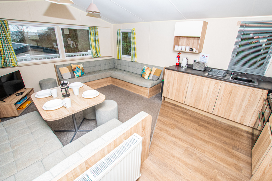 KITCHEN & DINING AREA: The kitchen is fully equipped to include; integrated fridge/freezer, oven & grill, extractor fan and microwave. The dining area benefits from L-Shape bench seating and two stools.