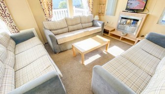 LOUNGE: Open plan lounge with 2 and 3-seater sofas, French doors leading to the veranda. Flat screen TV with Freeview and DVD player.