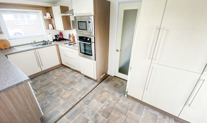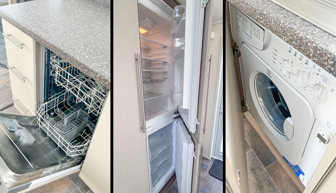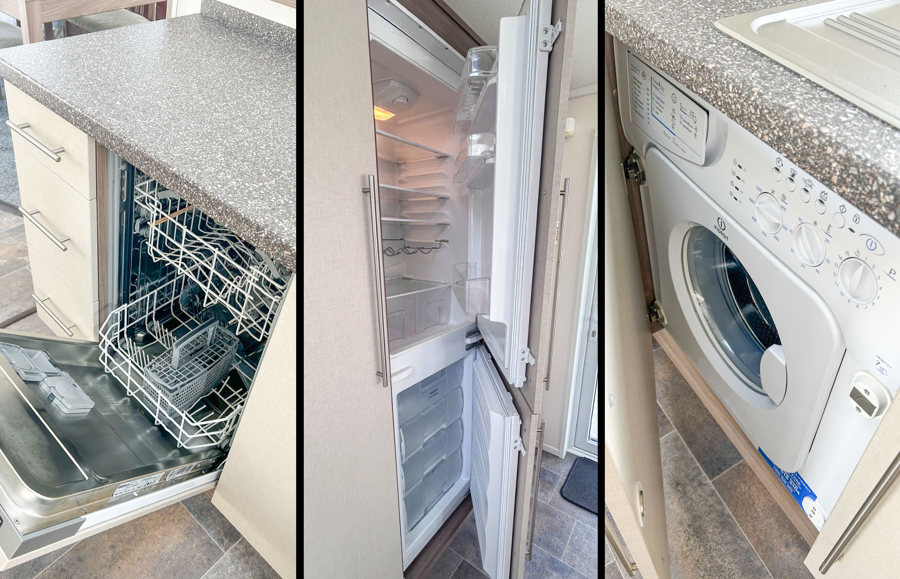 KITCHEN & DINING AREA: The kitchen benefits from a oven and grill, gas hob with four rings, extractor fan, microwave, washing machine, dishwasher and ample storage. The kitchen also benefits from a 60/40 fridge freezer. The dining area has plenty of natural lighting due to two large side windows and benefits from free standing dining table and chairs.