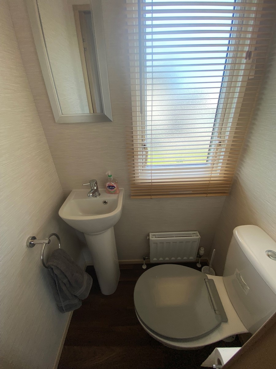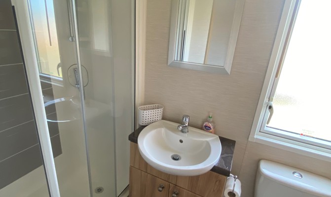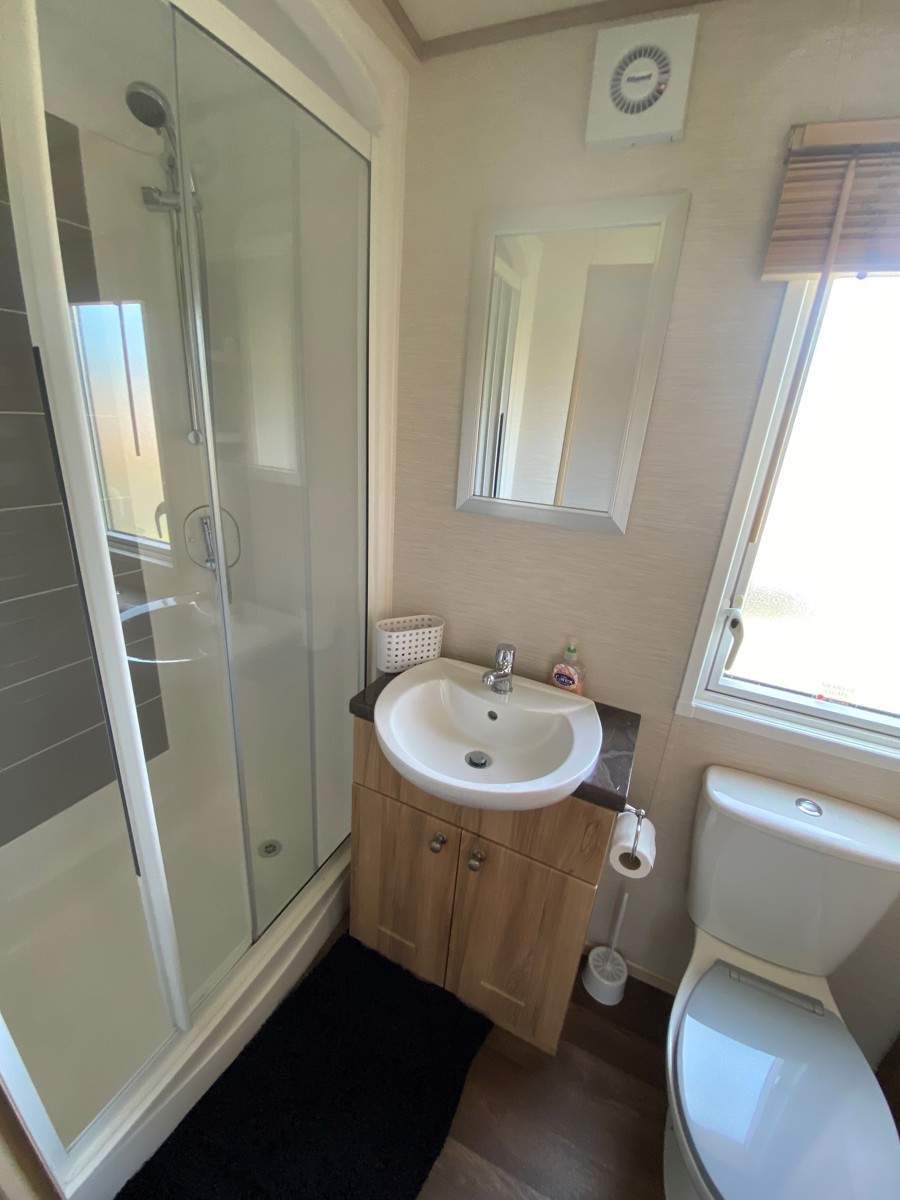 BATHROOM & TOILET: Shower cubicle, toilet, hand basin and radiator. The caravan also has a separate toilet.