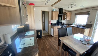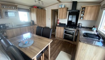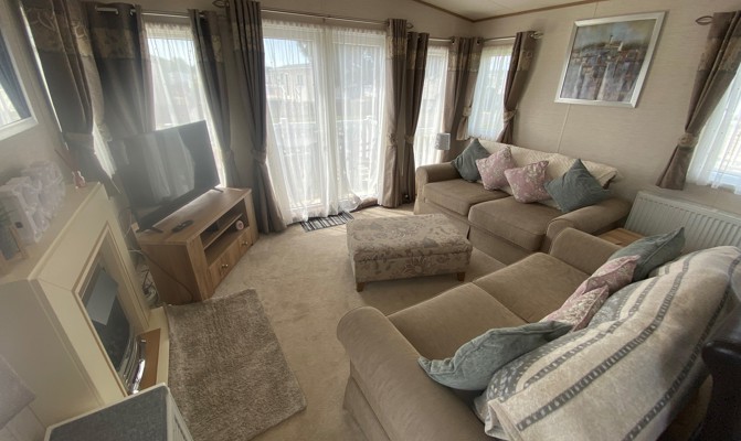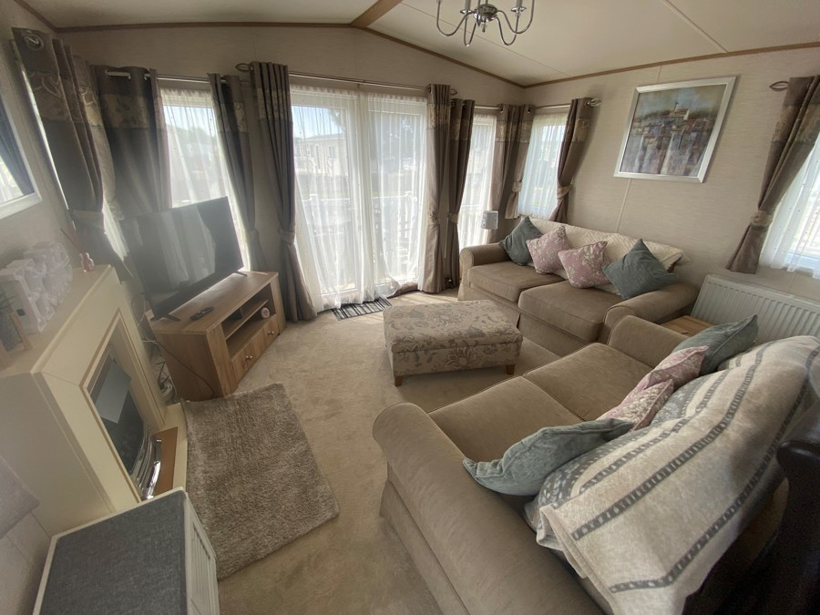 LOUNGE: Open plan with large seating. French doors the decking, flat screen TV with Freeview and DVD player. Coffee table, electric fireplace, and radiator. Occasional pull-out sofa bed is available for extra guests. Maximum of 8 guests.
