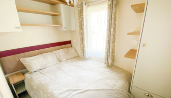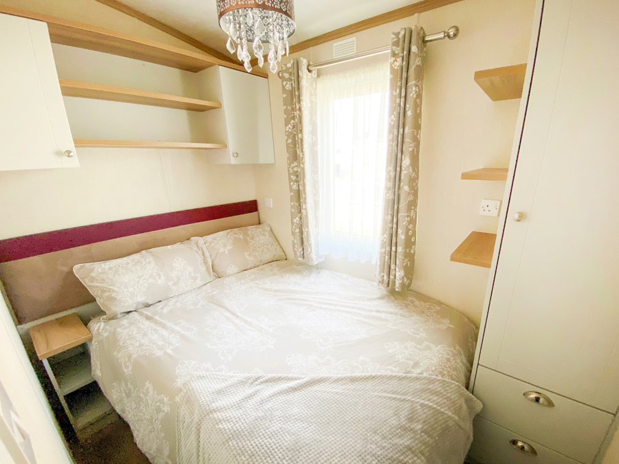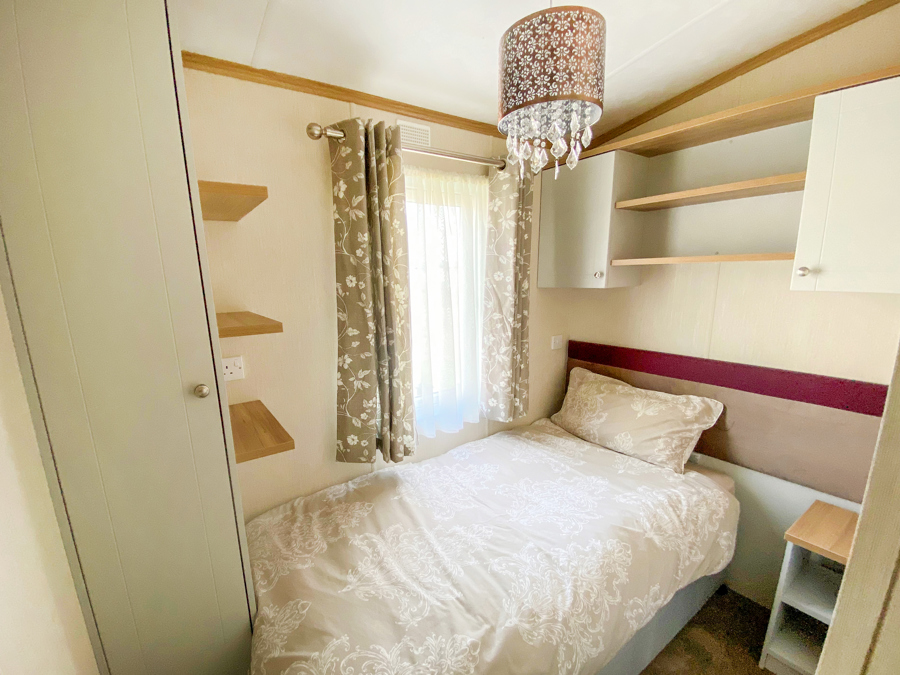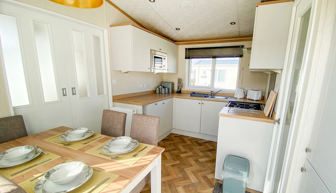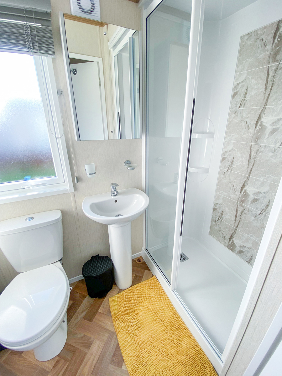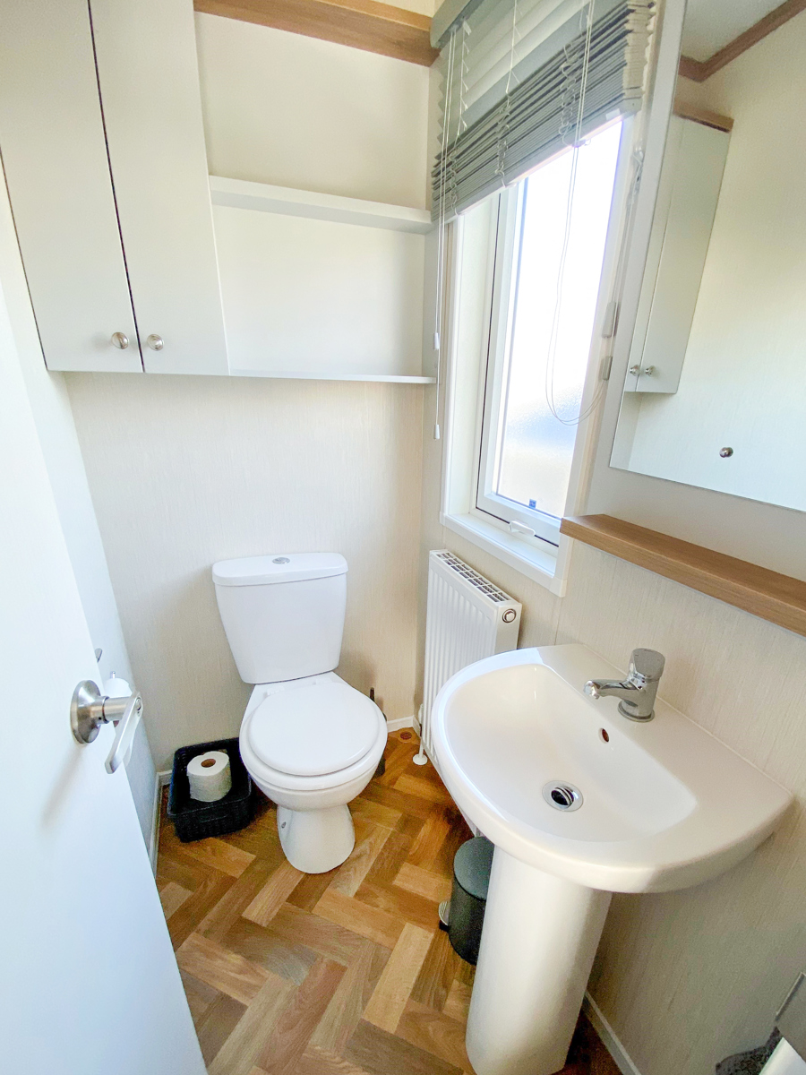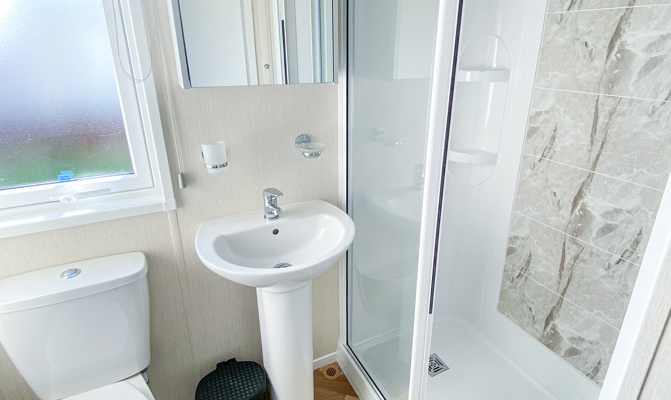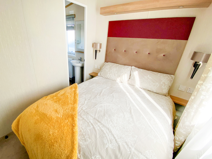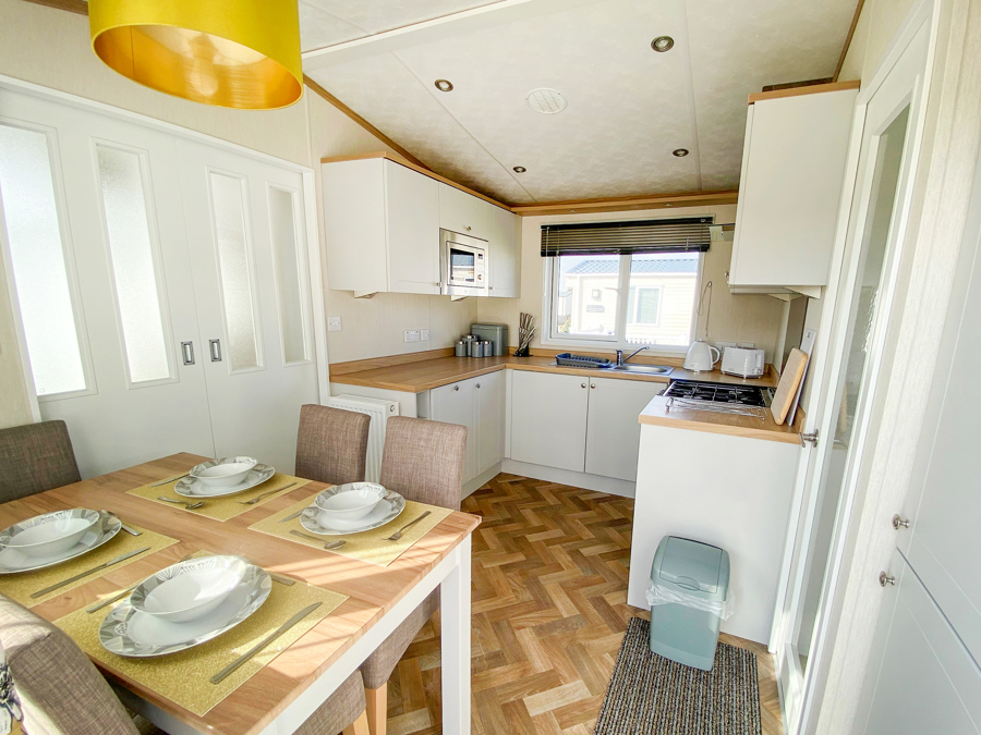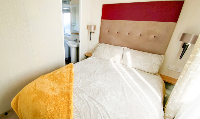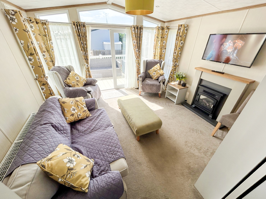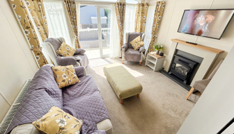 LOUNGE: Open plan with large seating. French doors, flat screen TV with Freeview . Coffee table, electric fireplace and radiator. Occasional pull bed is fitted for extra guests. E16 can sleep a maximum of 7 guests.