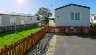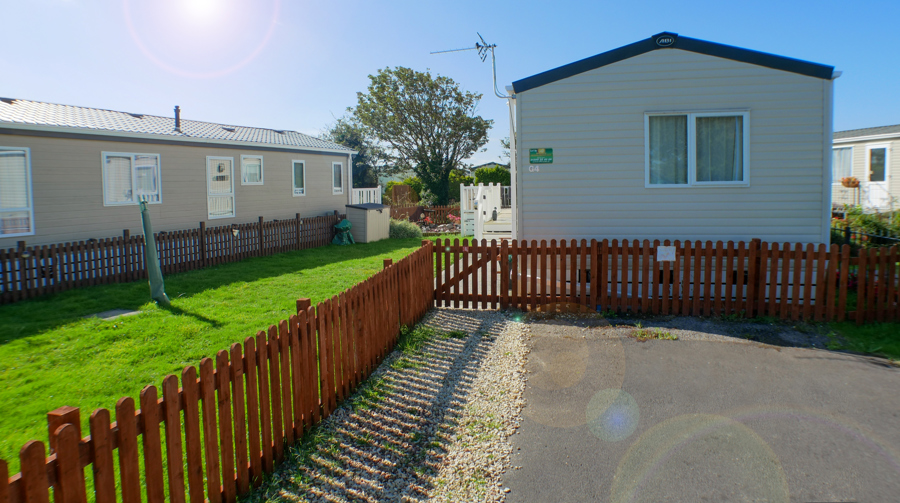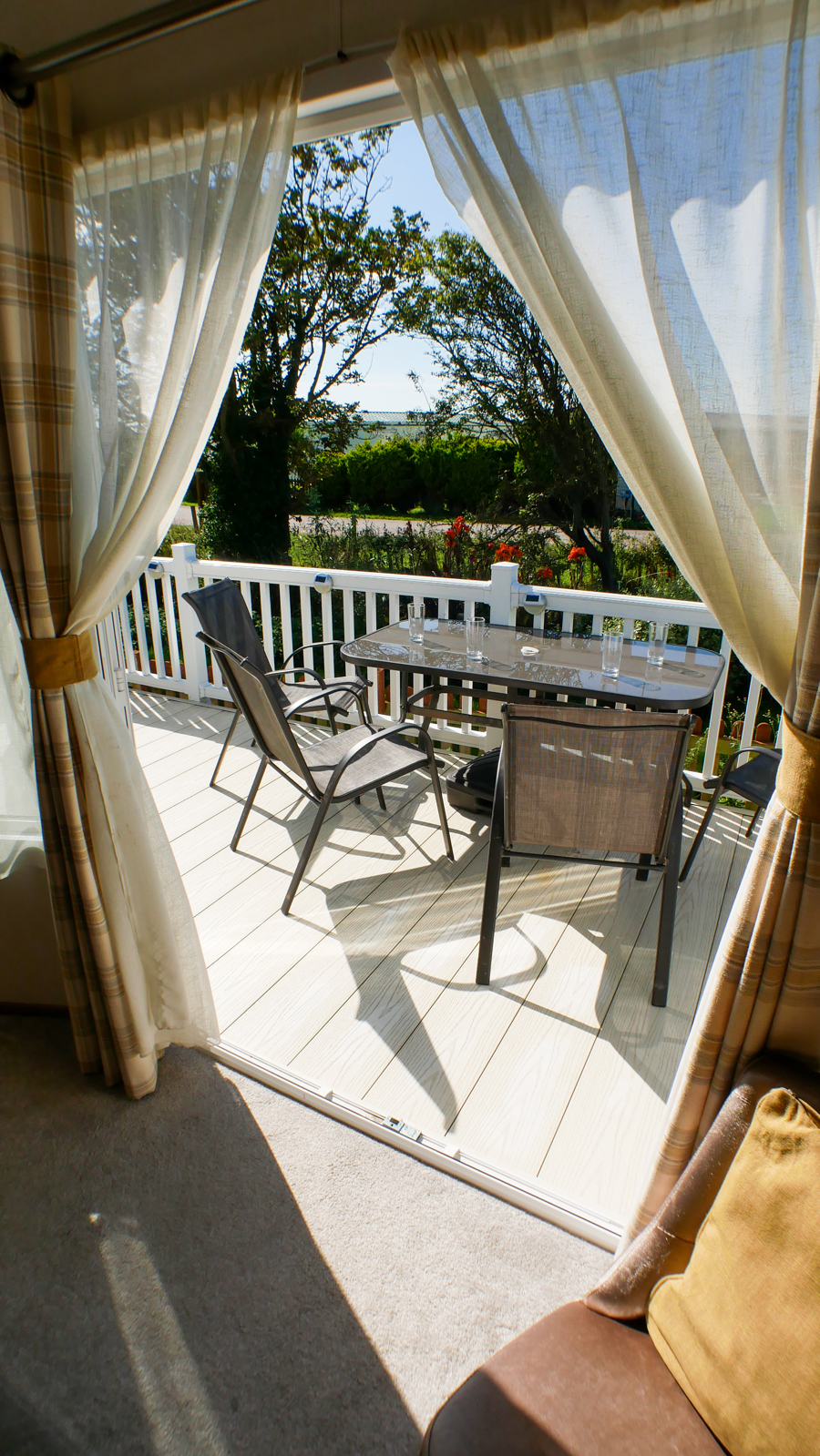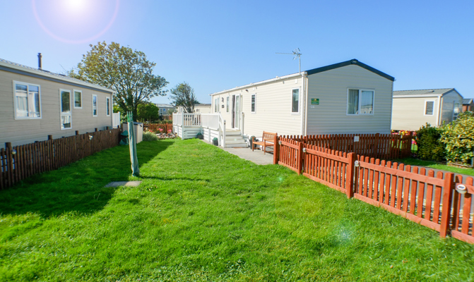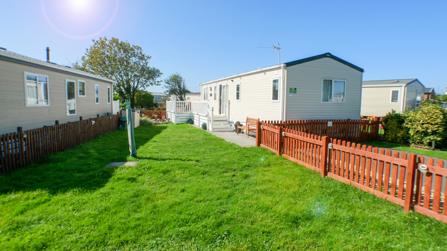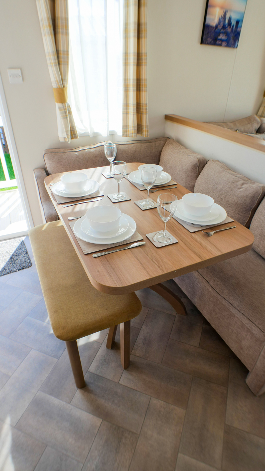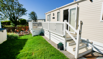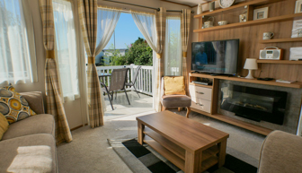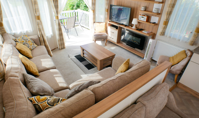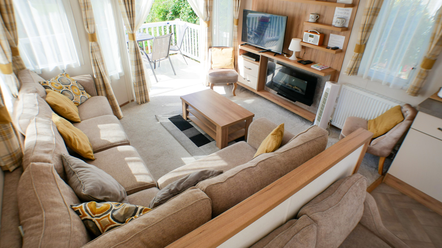 LOUNGE: This holiday home benefits from a comfortable lounge furnished with fixed corner seating, there is an occasional pull out bed, for extra guests, flat screen TV, Free view, electric fire and French doors that open on to the veranda.
