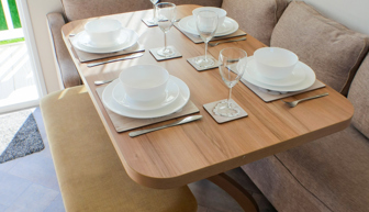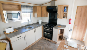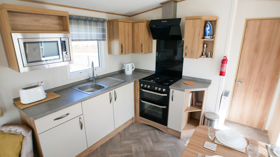 KITCHEN & DINING AREA: Modern kitchen which includes integrated fridge/freezer, oven with extractor fan and microwave and items required to cater for the family whilst on holiday. The dining area benefits from dining table, fixed corner seating and additional stool.