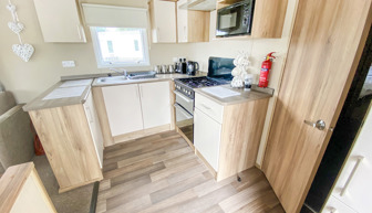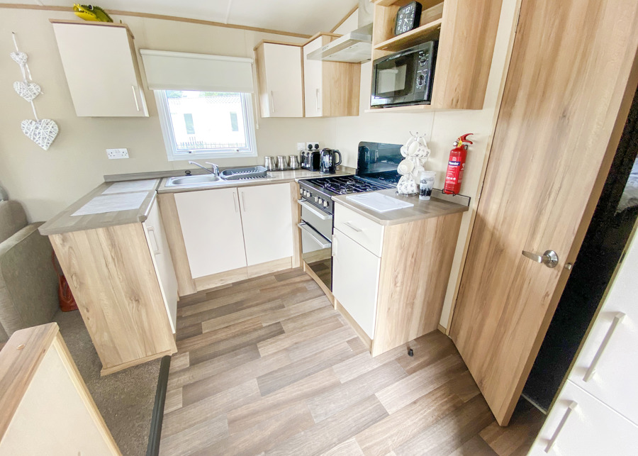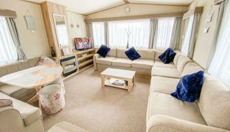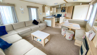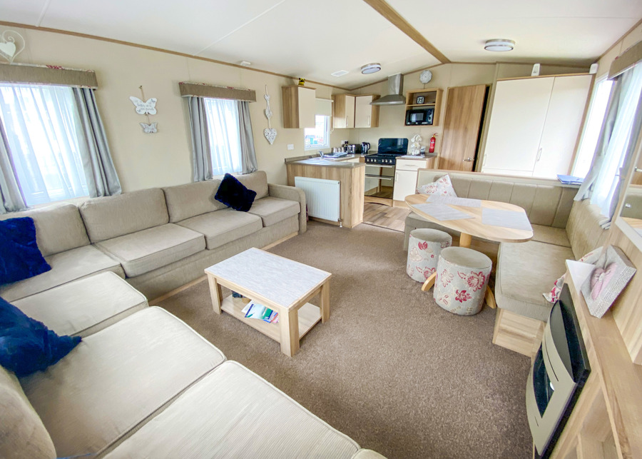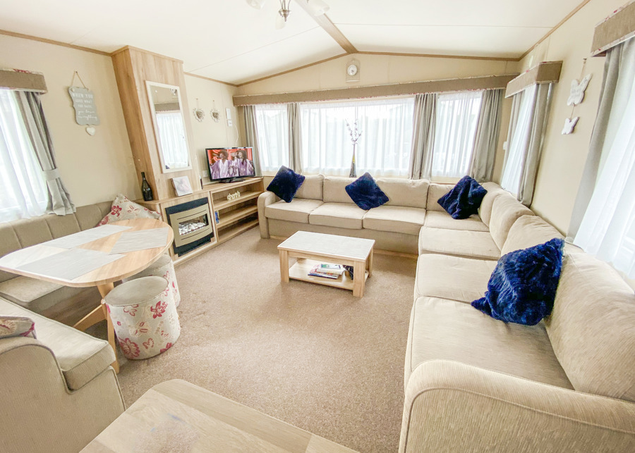 LOUNGE: This holiday home offers a spaciously open plan design, fixed corner sitting to cater for all the family, built in cabinets with flat screen TV, DVD and gas fire. Occasional pull-out bed is available for extra guests.