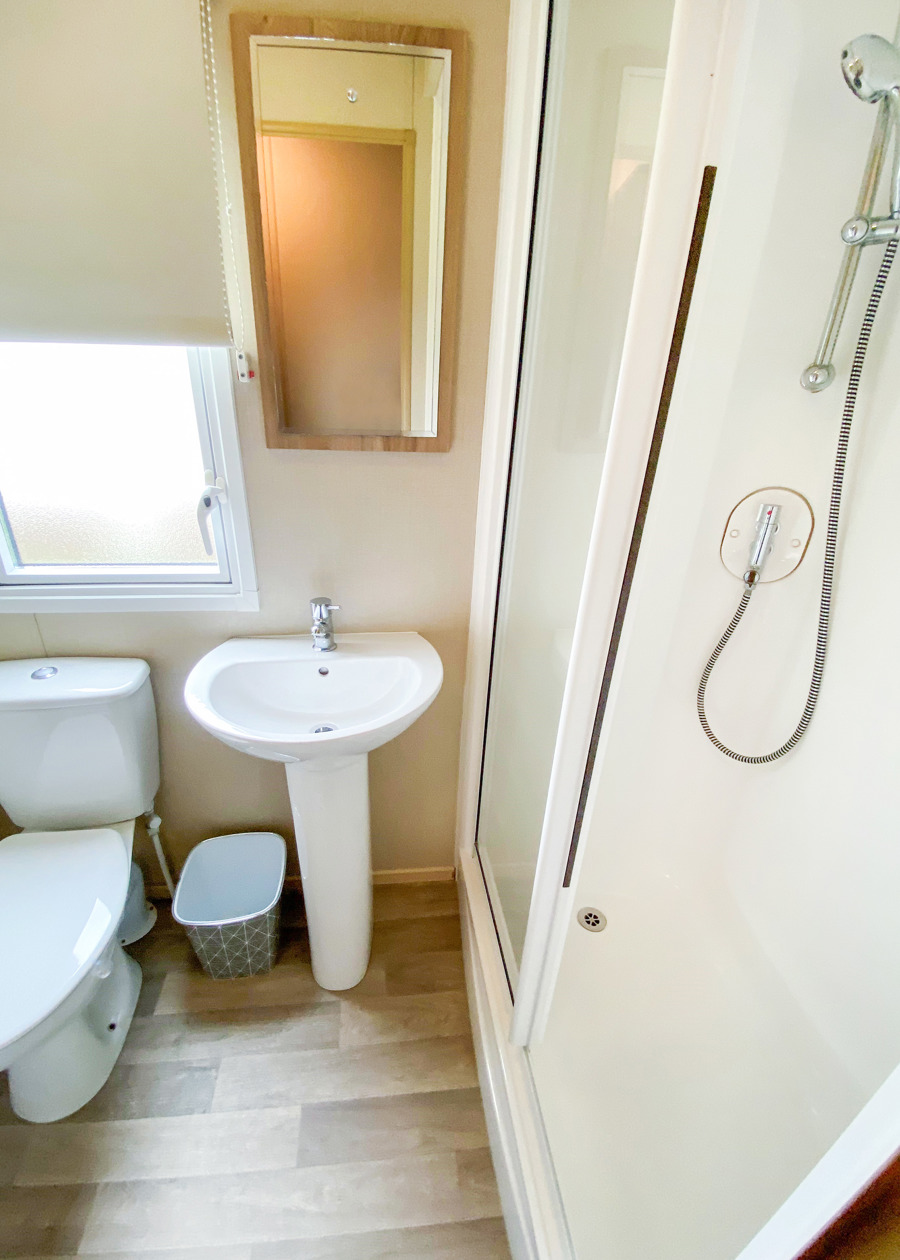 BATHROOM: The bathroom has a double shower, toilet, wash basin and heated towel rail.