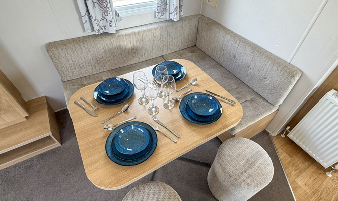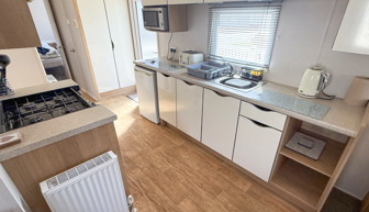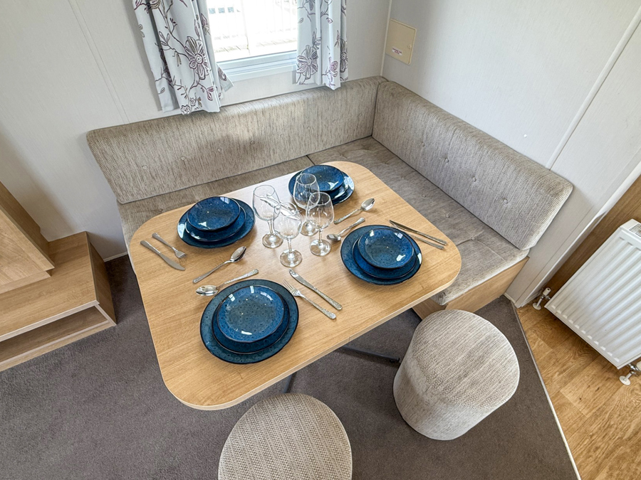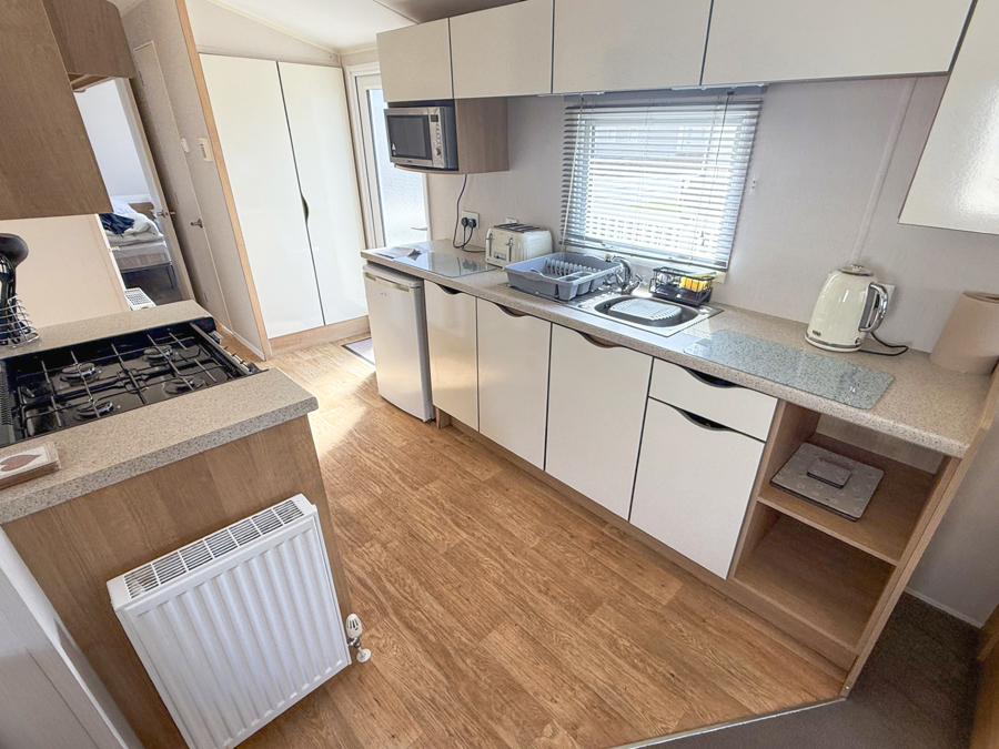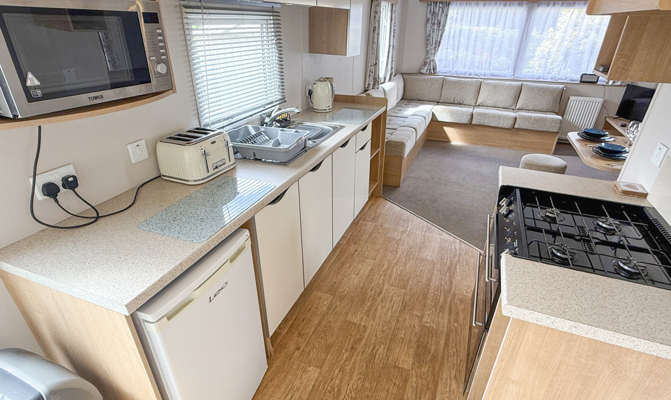 KITCHEN & DINING AREA: Well-appointed kitchen with a fridge, microwave, hob, cooker. The dining area is spacious and benefits from both bench seating & stools.