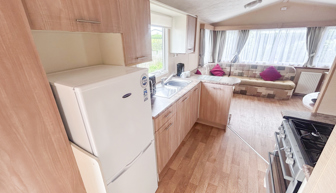 KITCHEN & DINING AREA: Kitchen is fully equipped which includes full size cooker, fridge (with small freezer box) and microwave. The dining area is comfortable with fixed seating plus stools.