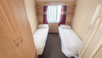 In the twin bedroom the beds can be pushed together to form an additional double and also has small wardrobe.