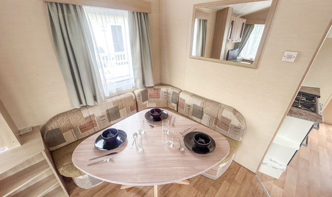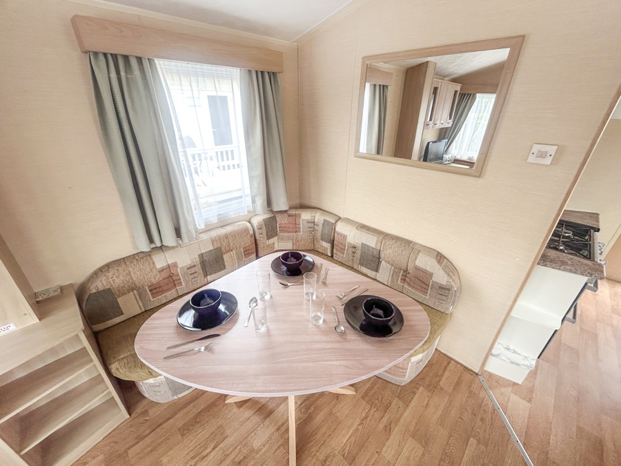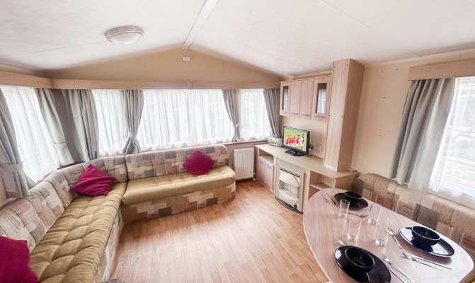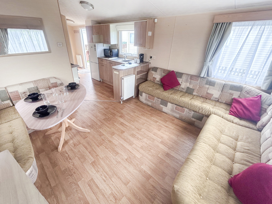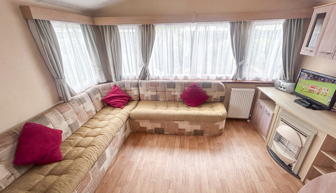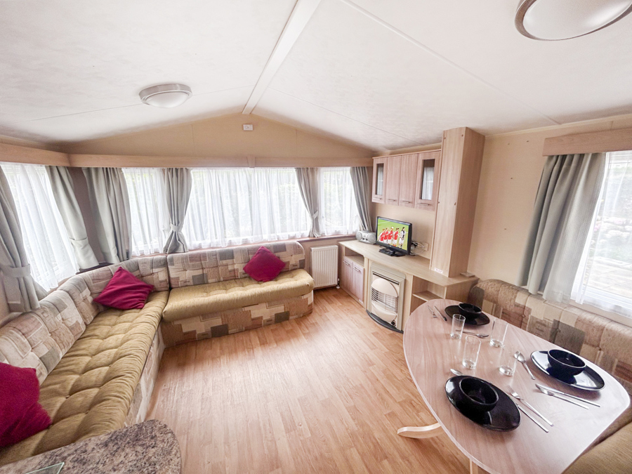 LOUNGE: Spacious lounge with comfortable fixed seating, occasional pull out bed for extra guests, flat screen TV, DVD and Free view player.