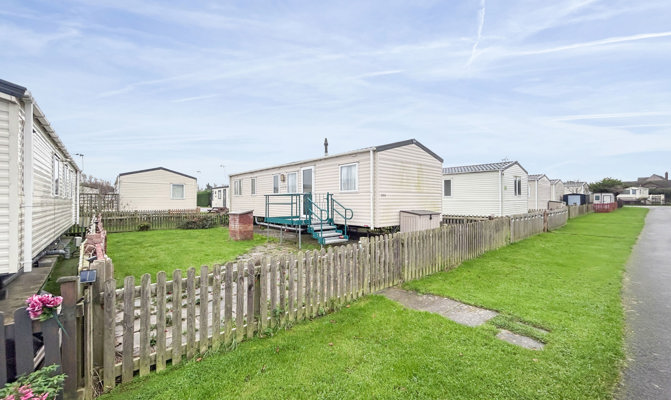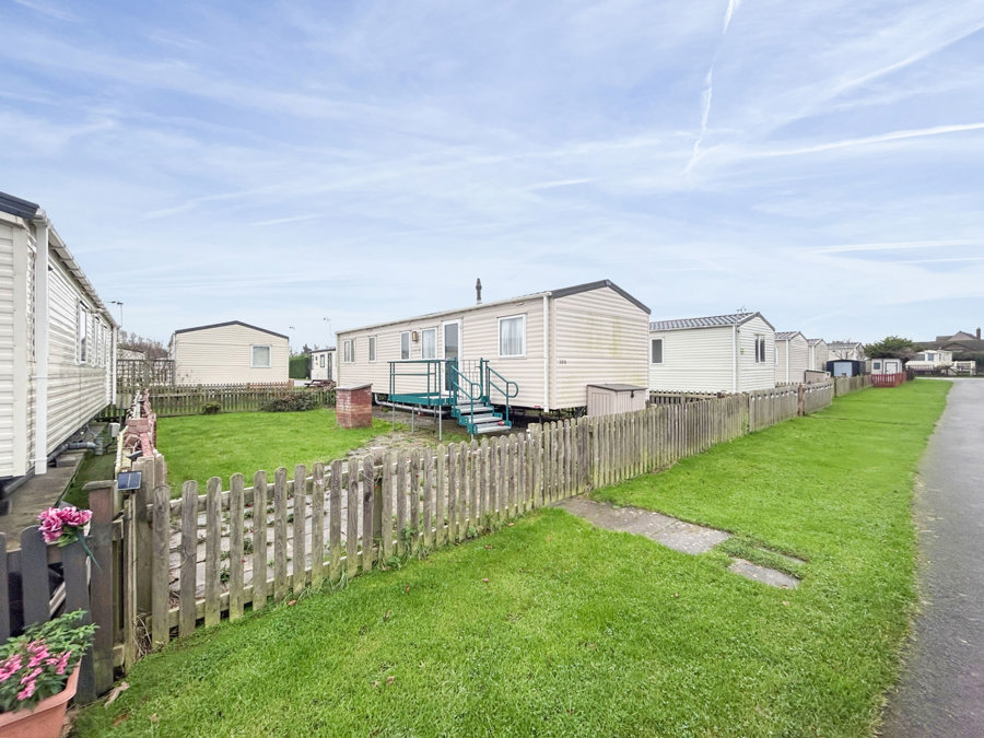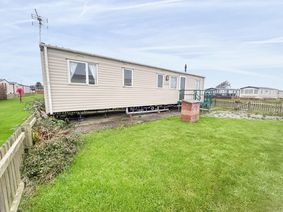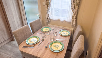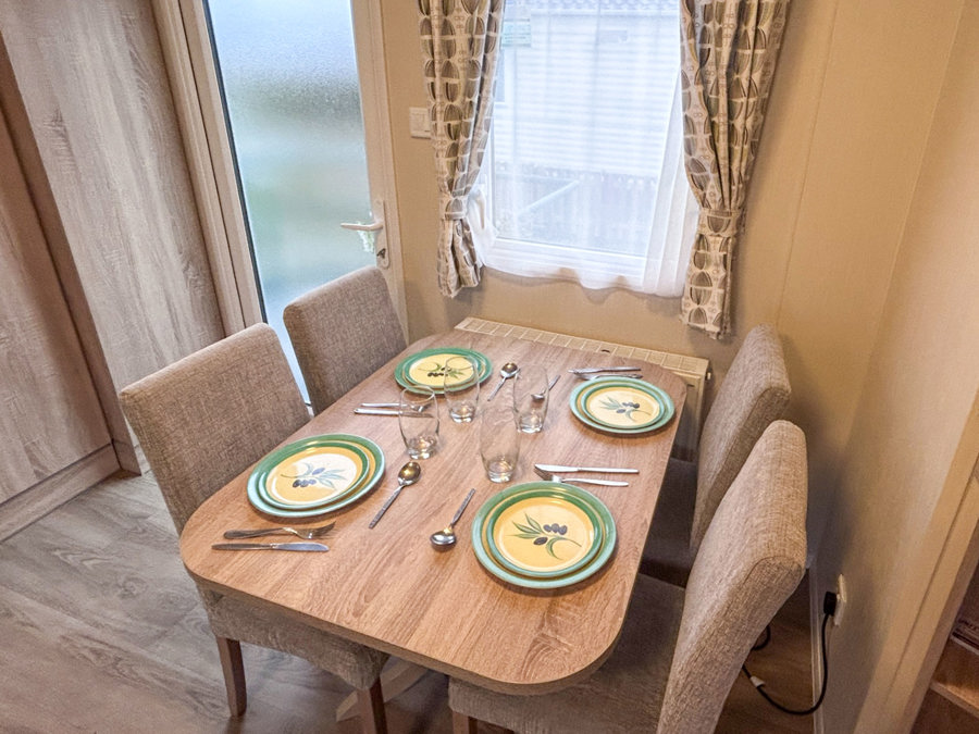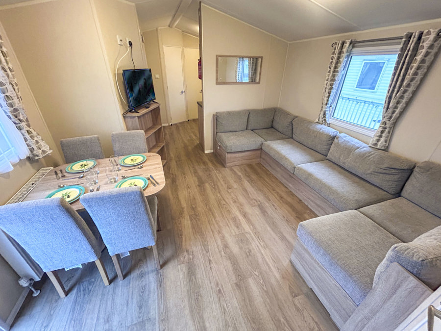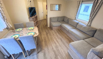 LOUNGE: This holiday home offers a spaciously open plan design with fixed sofa seating on one side, for additional comfort. Cabinet shelving with flat screen TV above and radiator behind the table.