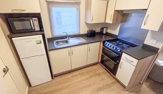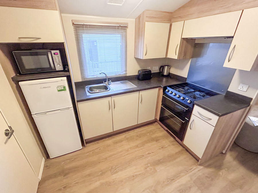 KITCHEN & DINING AREA: The kitchen is fully equipped which includes full size gas cooker, fridge freezer and microwave. Freestanding table, with 4 chairs located in the lounge as well.