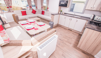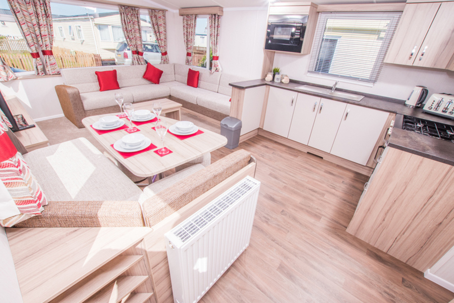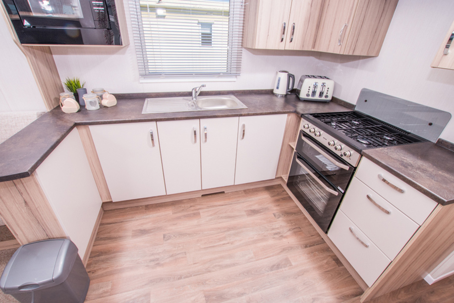 KITCHEN & DINING AREA: The well-appointed kitchen includes all the appliances you need, such as a separate fridge and freezer, microwave, hob and cooker. The dining area is spacious and includes bench seating and two stools.