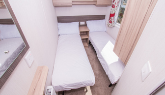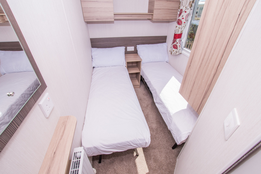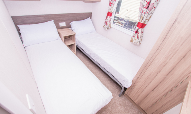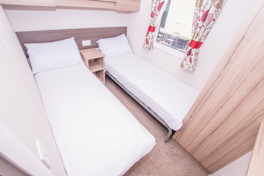 BEDROOMS: There are three bedrooms: one double room with fitted wardrobe and vanity area, and two twin rooms each with two single beds and small fitted wardrobes. The twin beds can be pushed together to form additional doubles. This holiday home accommodates up to 8 guests when using the sofa bed in the lounge.