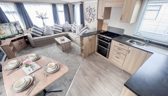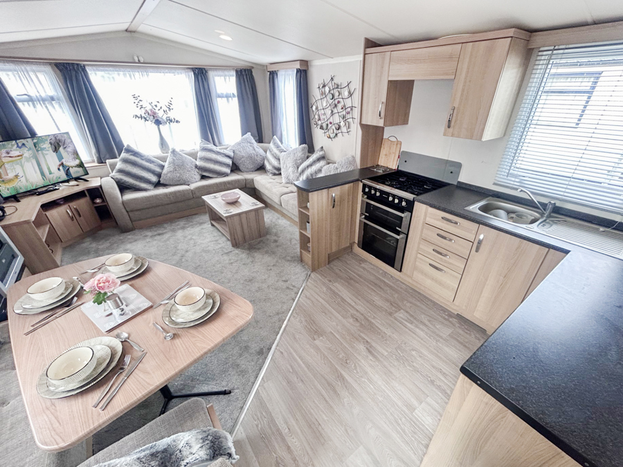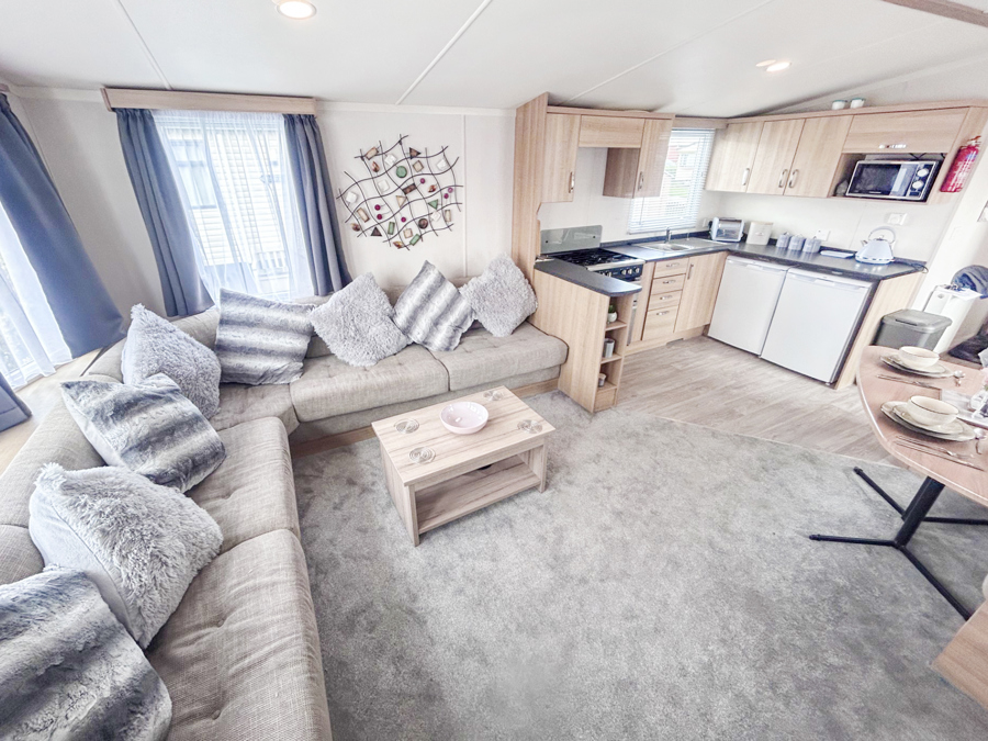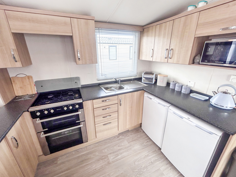 KITCHEN & DINING AREA: Well-appointed kitchen furnished to a good standard with appliances Inc. under counter fridge and freezer, microwave, hob, cooker. The dining area is spacious and benefits from fixed seating.