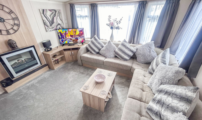 LOUNGE: The lounge incorporates fixed corner seating, with a flat screen TV, Free view and contemporary fireplace. The lounge seating includes an occasional pull out bed for those extra guests. Maximum 6 guests.