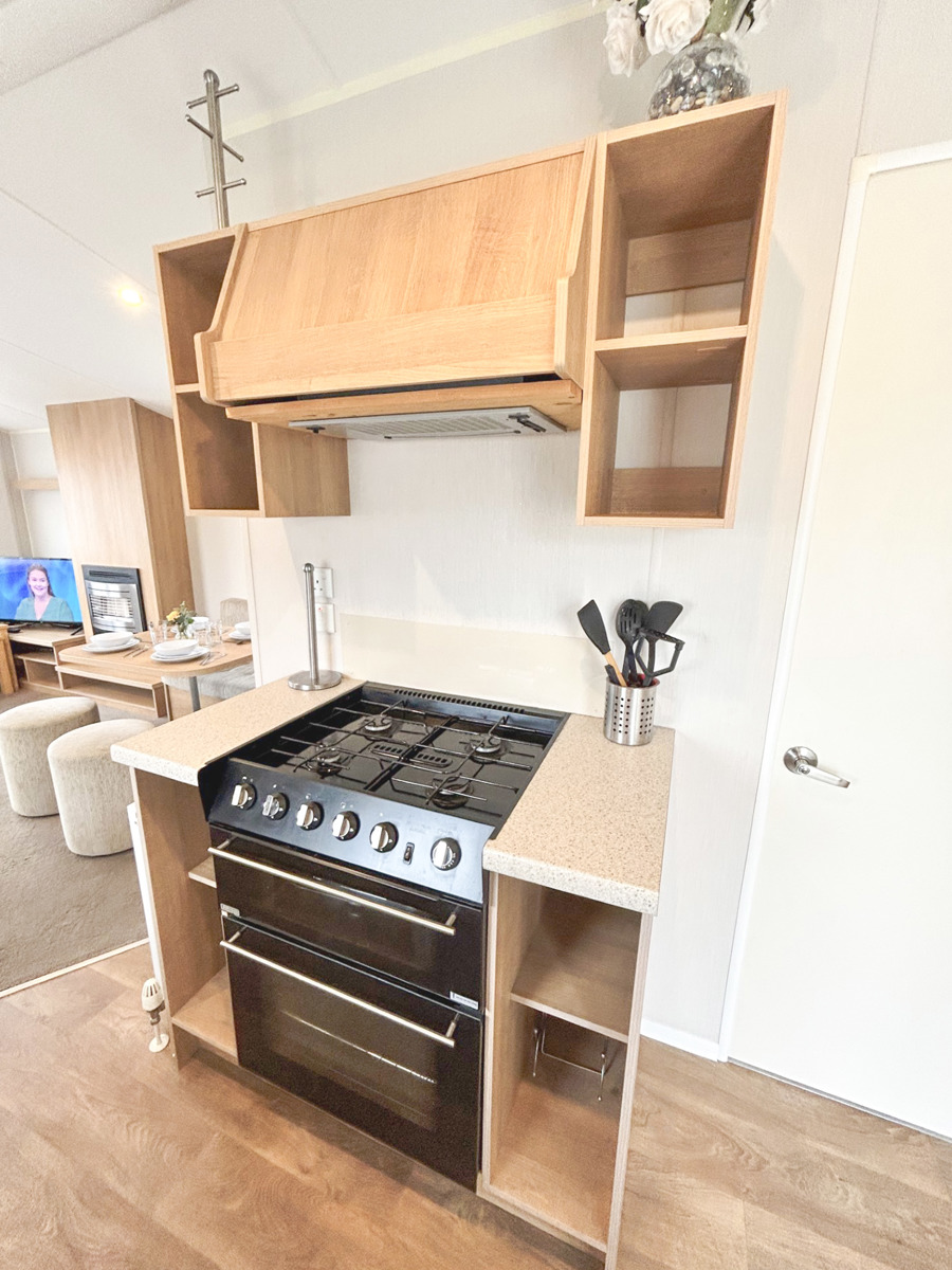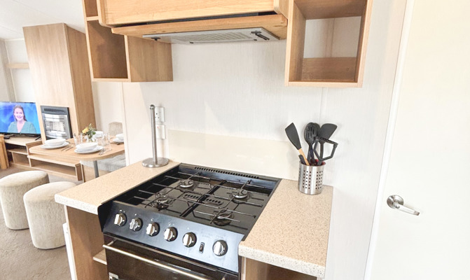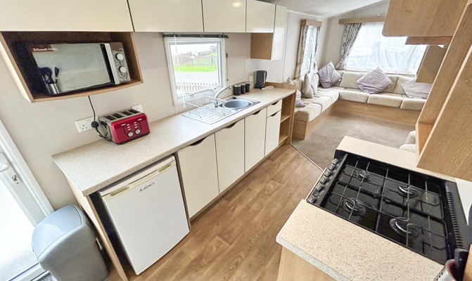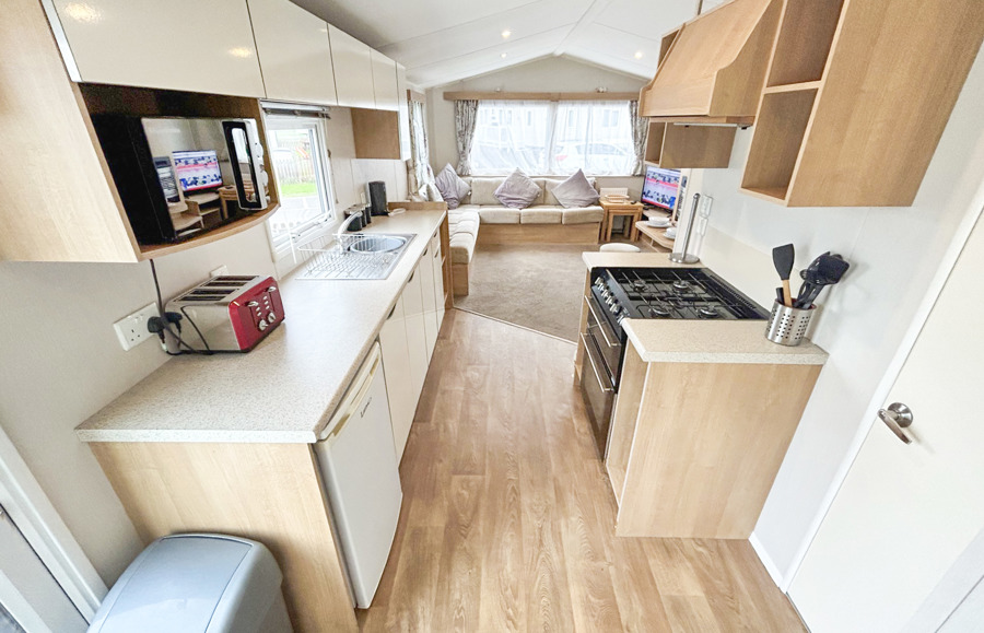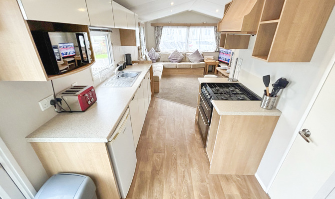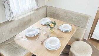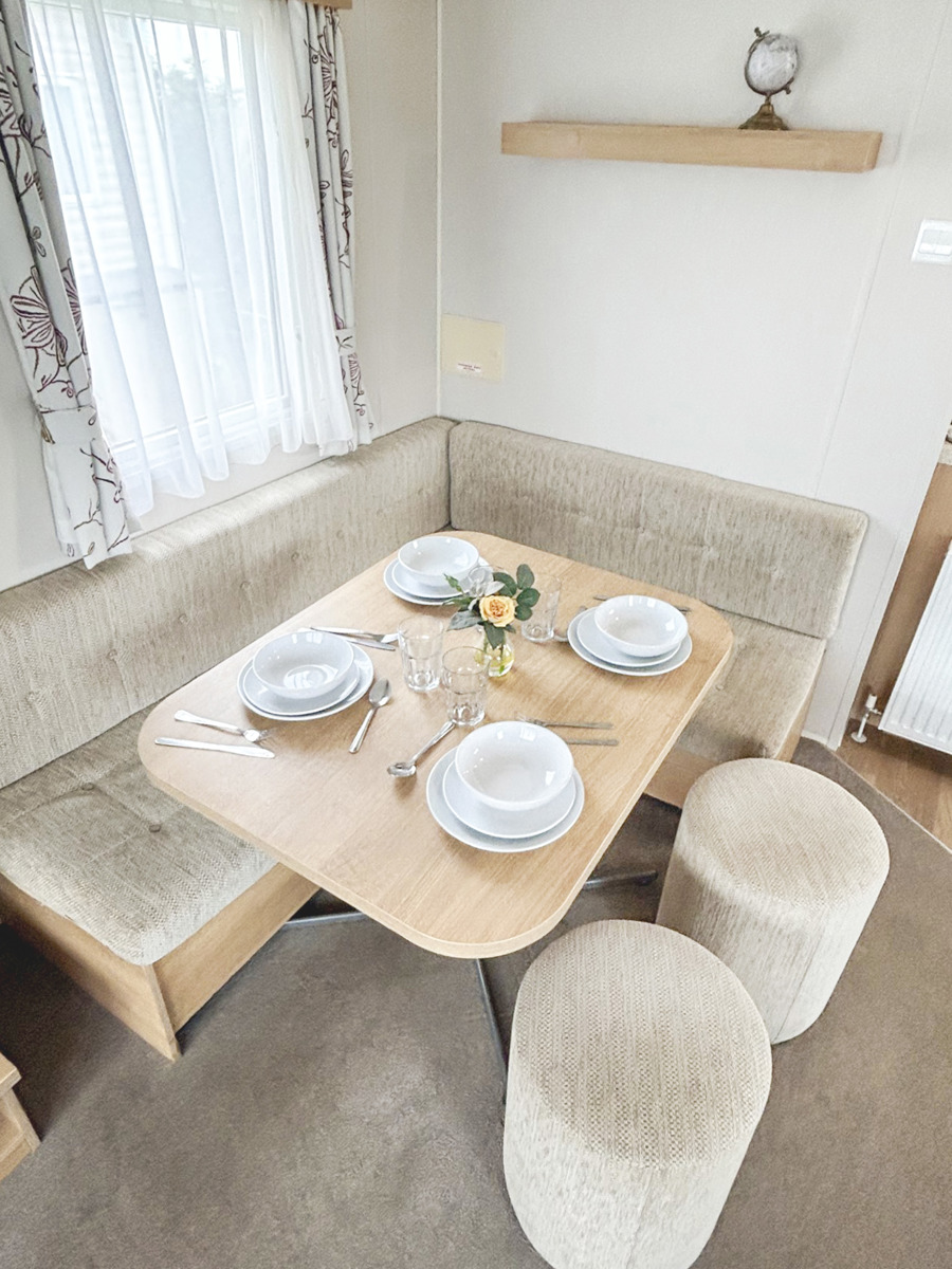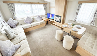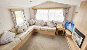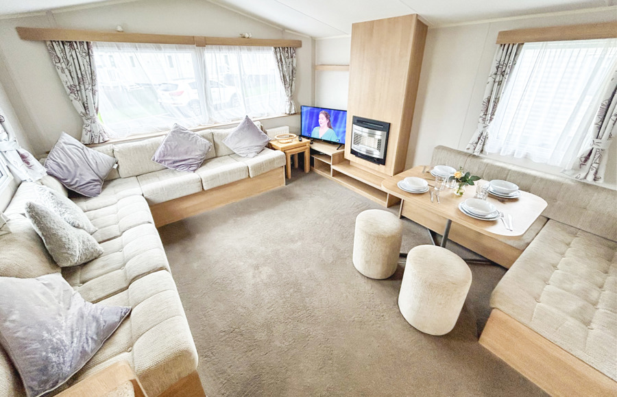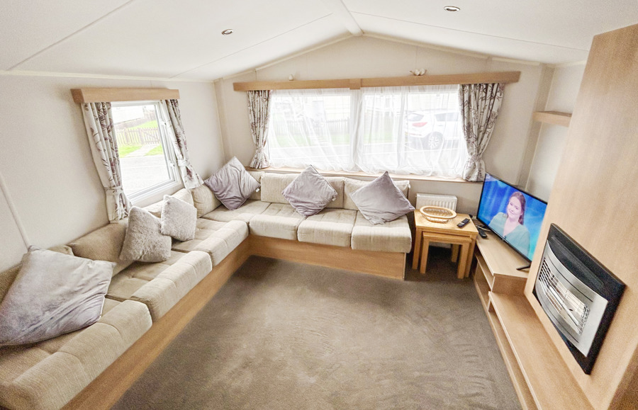 LOUNGE: Open plan design, fixed corner seating to cater for all the family, built in cabinets with flat screen TV, DVD and electric fire. The lounge includes an occasional pull-out bed. Maximum of 6 guests.