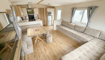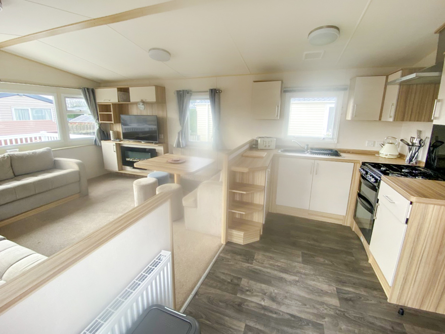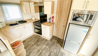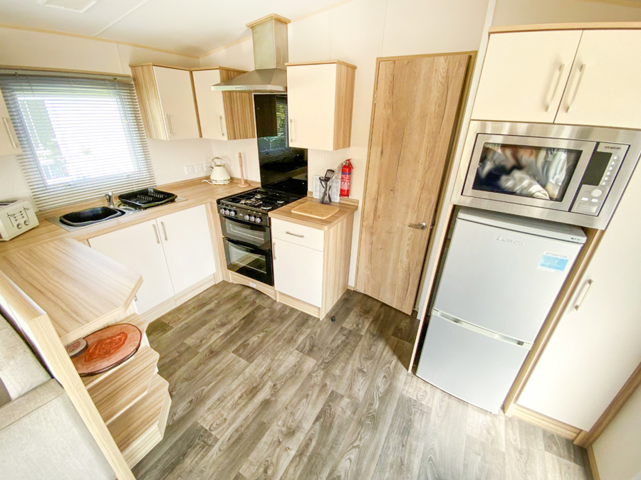 KITCHEN & DINING AREA: The kitchen includes fridge/freezer, oven with extractor fan and microwave. The dining area has free standing dining table, fixed corner seating and 2 chairs.