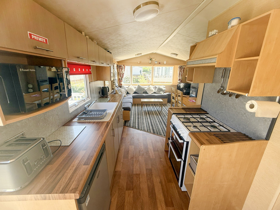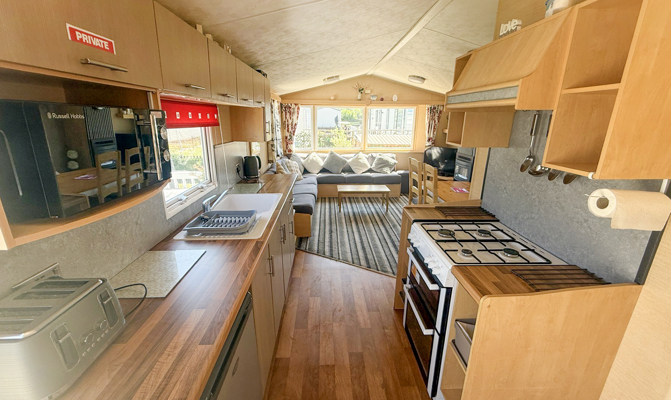 KITCHEN & DINING AREA: This lovely holiday home offers comfort with a spaciously designed interior, the modern kitchen is fully equipped which includes full size cooker, fridge and microwave. The dining area is comfortable with fixed seating plus stools.