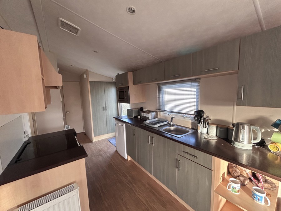 KITCHEN & DINING AREA: The modern kitchen is fully equipped which includes full size cooker, fridge freezer and microwave. The dining area is comfortable with fixed seating plus two additional stools.