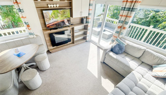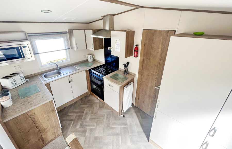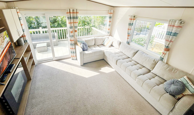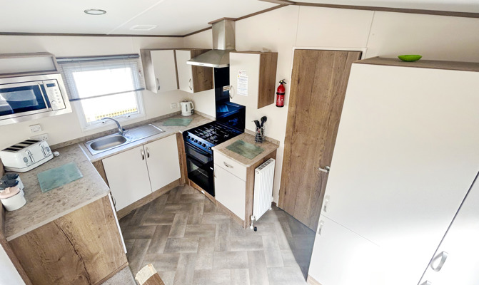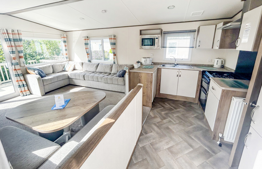 LOUNGE: Open plan with fixed L seating, TV with Free-view and DVD player and gas fireplace. Occasional pull-out sofa bed is available for extra Guests. Maximum of 6 guests.