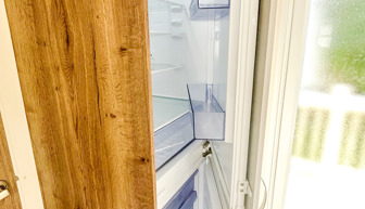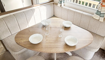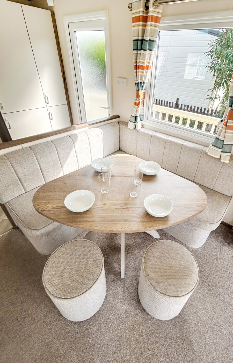 KITCHEN & DINING AREA: Equipped with necessary standard utensils, microwave, integrated fridge-freezer, gas oven and grill. The dining area is comfortable with a free standing table, fixed corner seating and two stools.