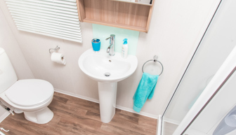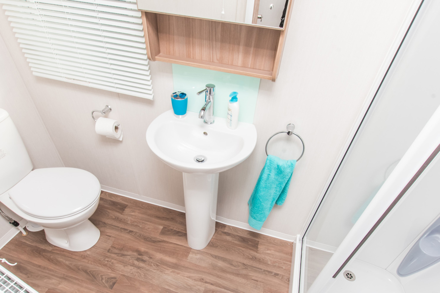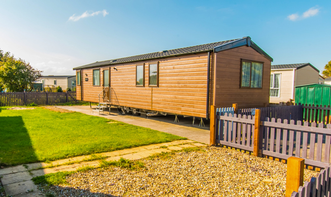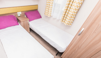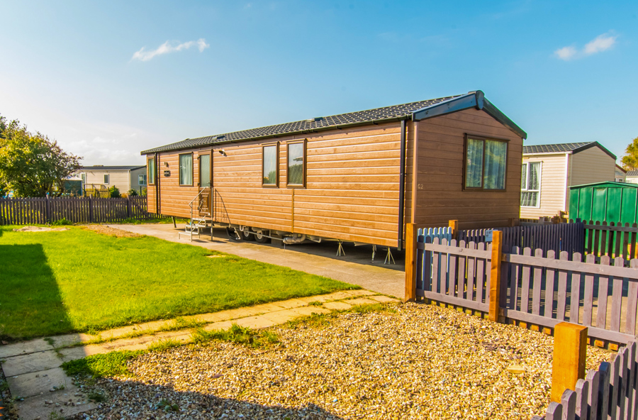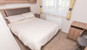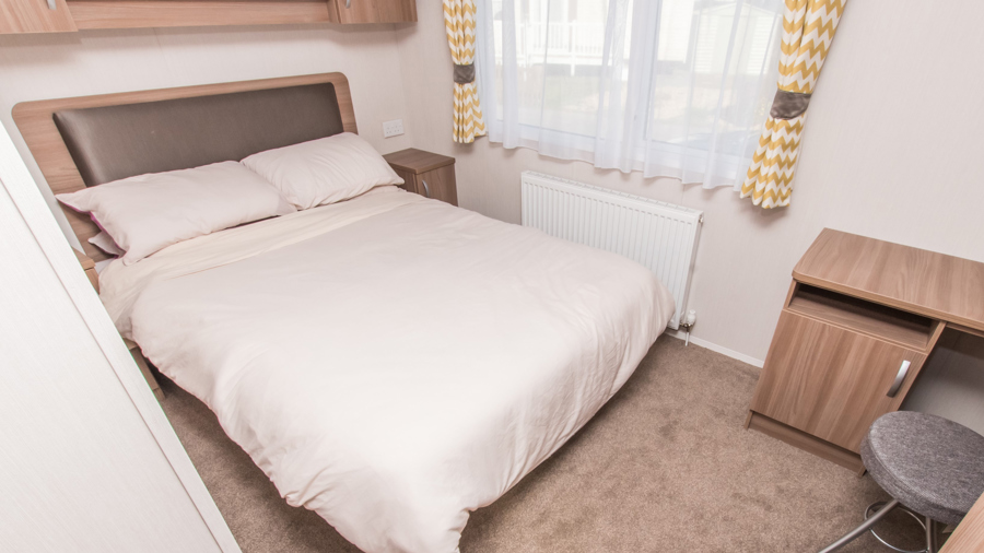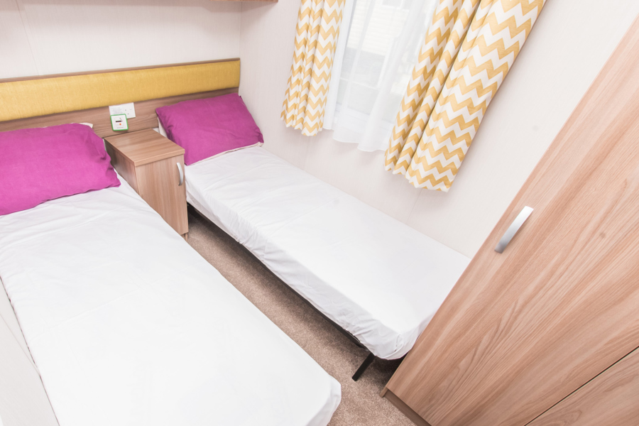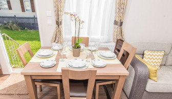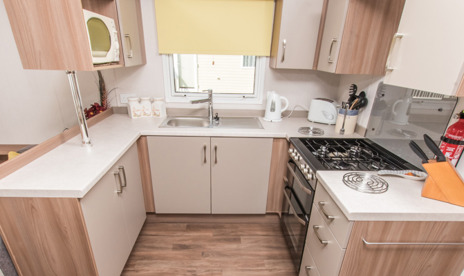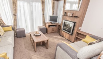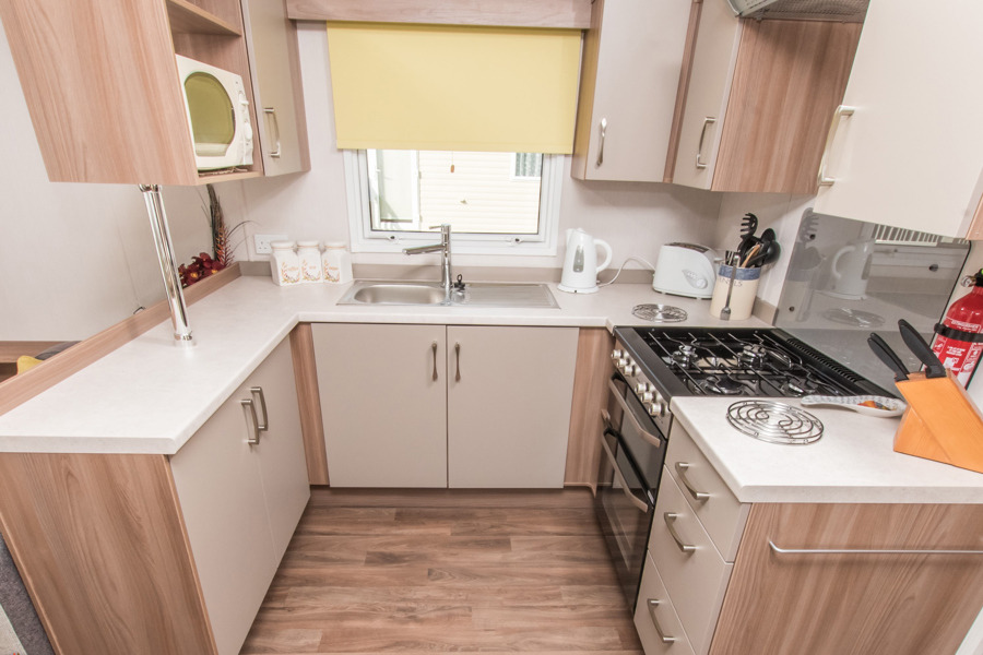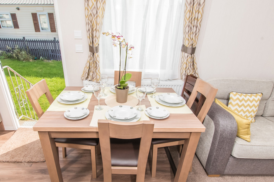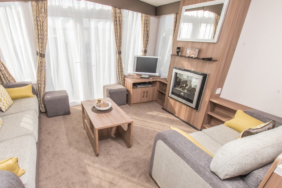 LOUNGE: This holiday home benefits from a comfortable lounge furnished with fixed corner seating, there is an occasional pull out bed available for extra guests, flat screen TV, Free view and DVD player, electric fire and patio doors that open on to steps.
