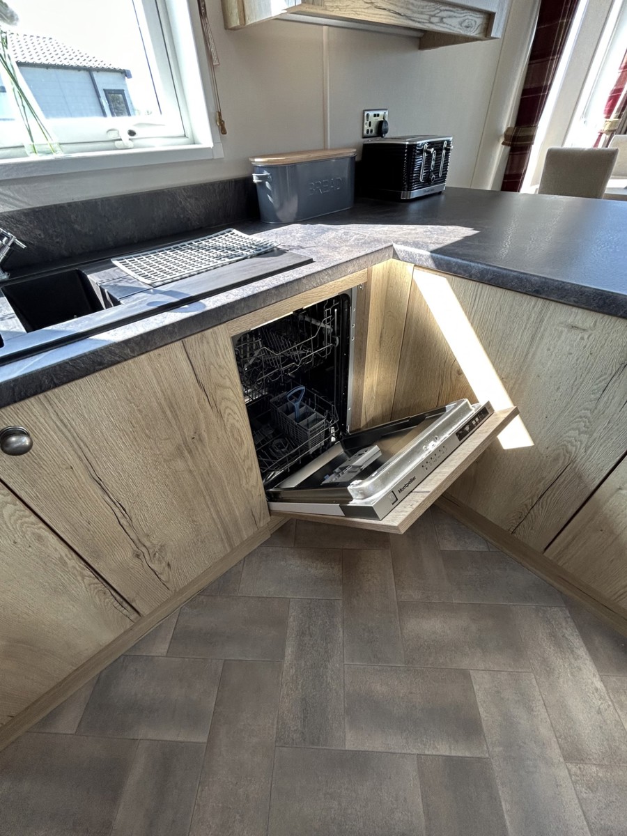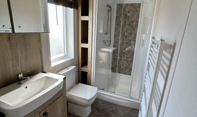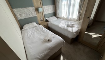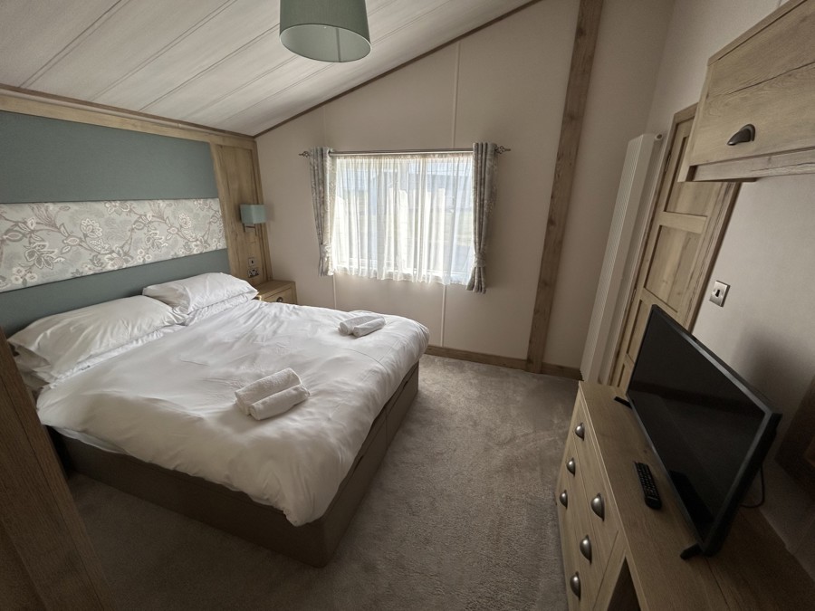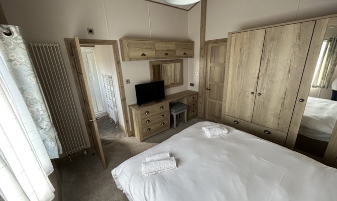 BEDROOMS: The master en-suite bedroom is generously sized and includes a king-size bed, TV, wardrobe and chest of drawers set, room for a travel cot, full en-suite shower room, toilet and wash basin. The twin bedroom continues the luxury feel of the 2-bedroom Lodge. Complete with 2 single beds, fitted wardrobe and bedside cabinets.